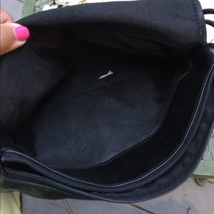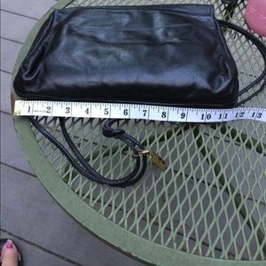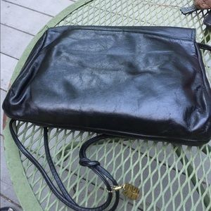 Black handbag. Shoulder strap. Pleated design front flap. I believe it is leather. No tags. Nice and soft feel