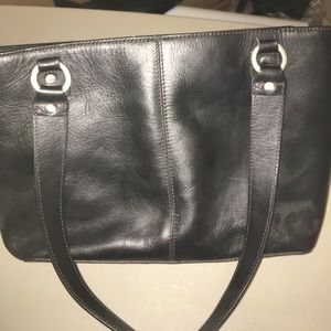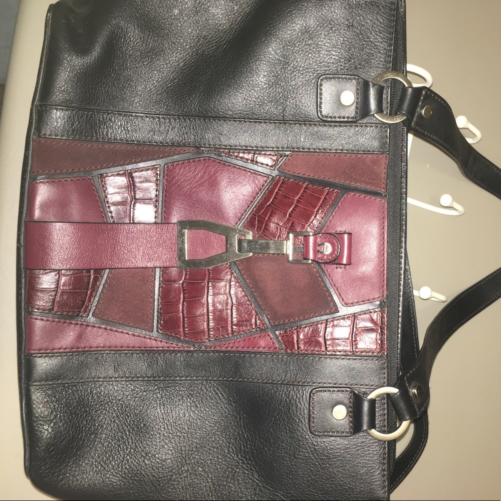 This handbag is a very dark almost black color with brownish colors in the center and brass. It has two compartments inside and includes a zipper pocket with two cell phone type pockets.