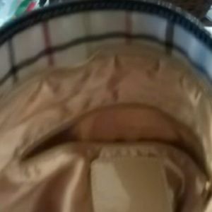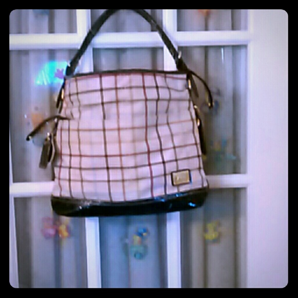 NWT Cotton bucket bag. Multi colored plaid with faux black patent leather trim and handle. Has extra strap so can be worn as a cross body bag.