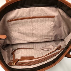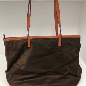This Michael Kors tote bag can handle all seasons due to its nylon fabric. It's a great neutral color that can accessorize any outfit. The bag features cell phone pockets, logo-jacquard lining, and a lengthy 8.75" strap drop. You will feel secure carrying this tote around, as there is a zipper that spans across the top of the bag.