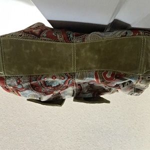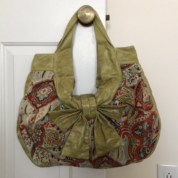 Cute boutique handbag. Can be a tote or shoulder bag. Light olive with paisley detail. Cute for spring or fall. Normal wear on the handles and green part, but tons of life left! Smoke free/pet free.