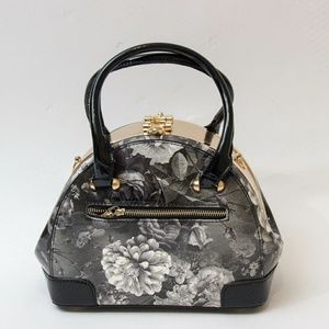 A Retro1950 black rose print patent leather bag with a double clasp heart shape closure . Shoulder strap included. Height - 12 inches width - 10 inches