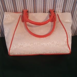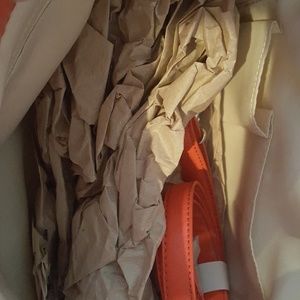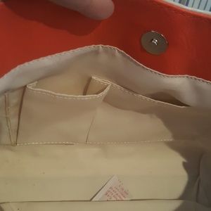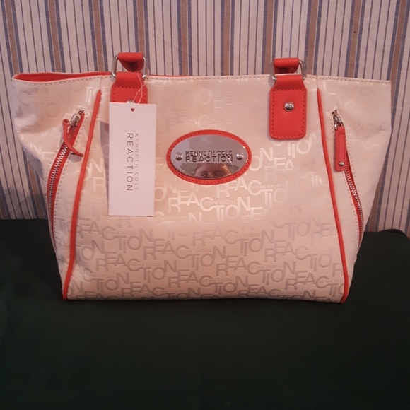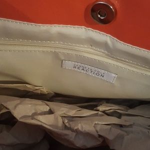 Kenneth Cole Reaction Handbag. Orange/cream color. Never carried. Side zipper outside compartments. Cell phone & zipper internal pockets. Comes with shoulder strap. Measurements are approximate.