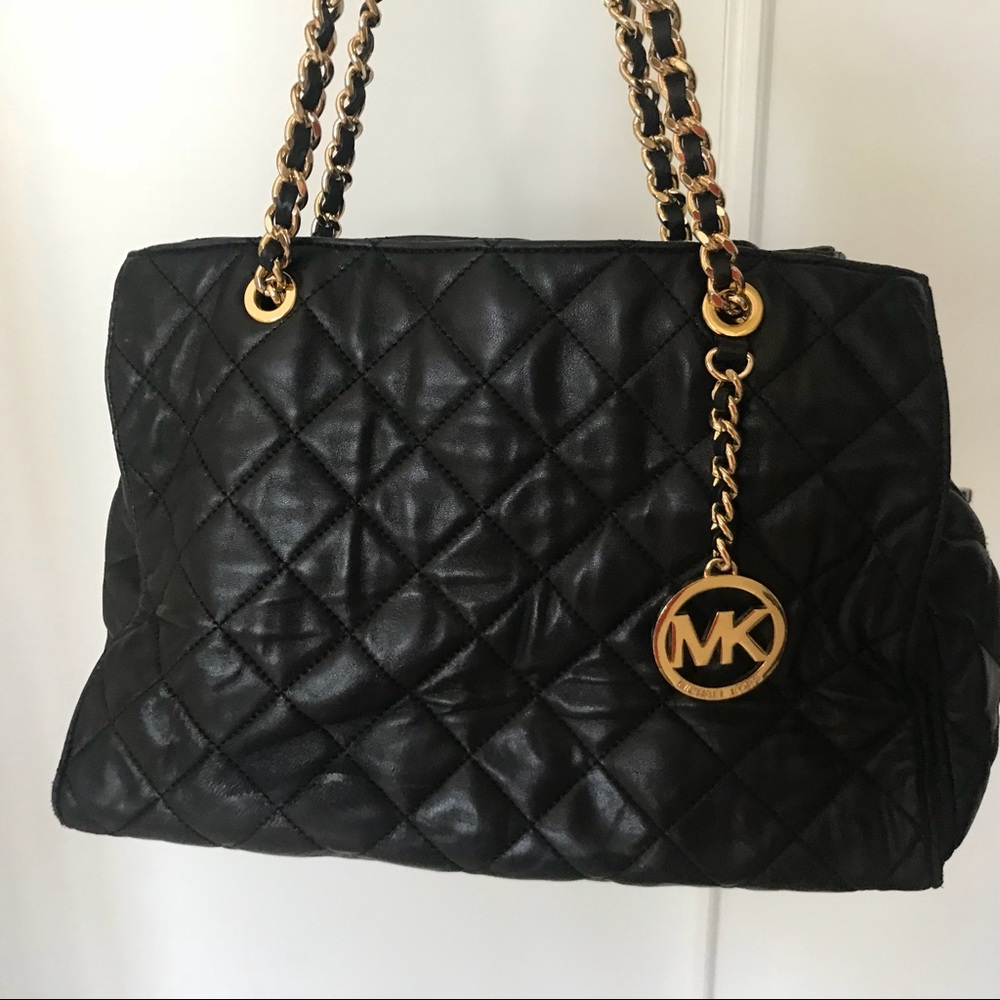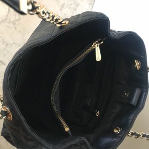 Michael Kors. Black. Soft leather. Gold hardware. Snap closure. 2 zippered compartments inside