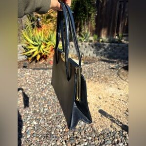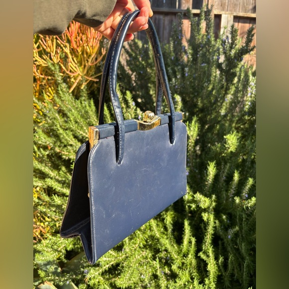 Vintage handbag purse bag tote boxy square bag minimalist 60's 70's Victorian quality high quality bag made in Canada has two pockets inside with clasp closure super cute staple bag dark blue color really good condition will last a lifetime similar to reformation Lolita mall goth 2000s 90s cyber club kid kawaii