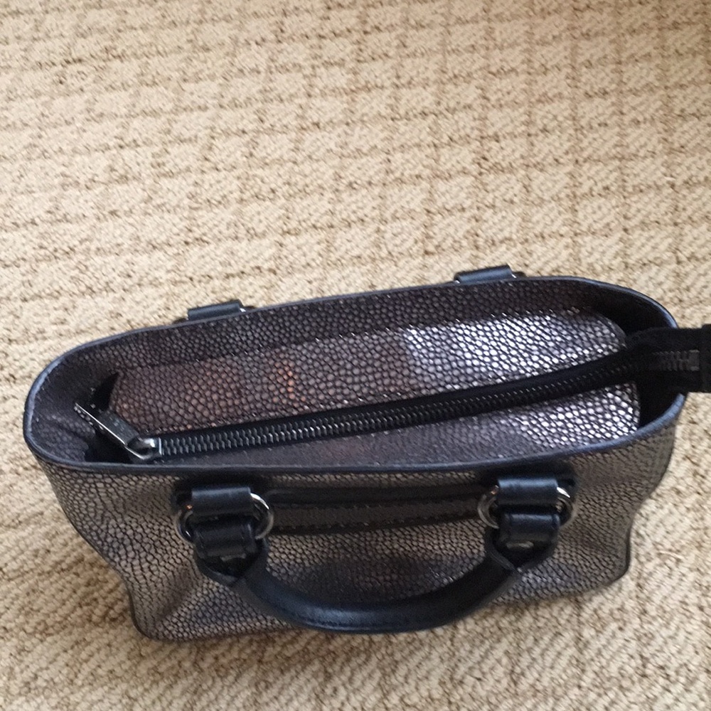 Celine two handle elegant handbag. Silver and black speckled leather. Worn for night time events. Top zipper .