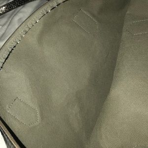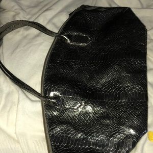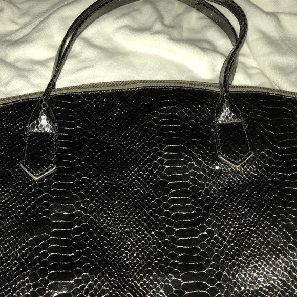 Silver snake skin pattern. Larger size but not to big for a store or a trip to the spa. I never got the chance to use it but the tags are not on it.