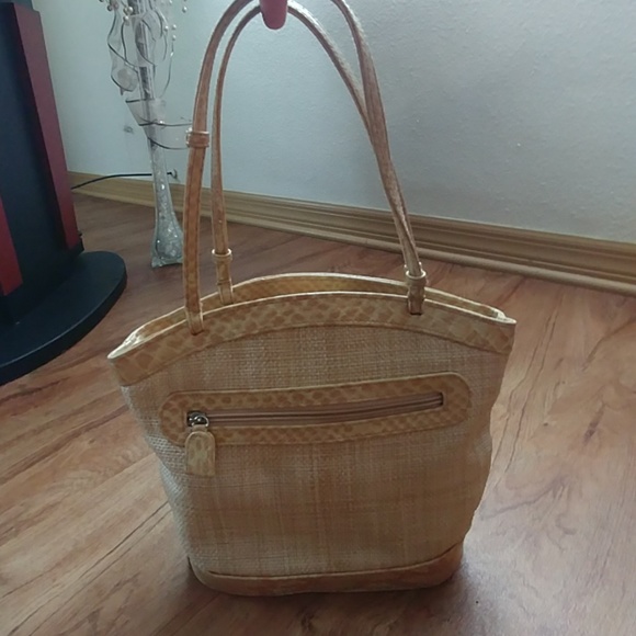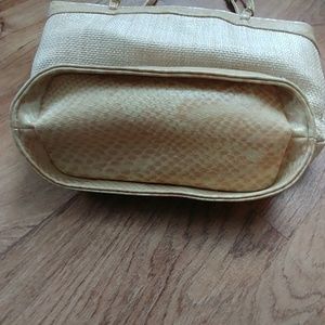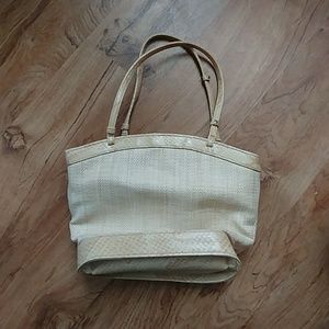 Cream and tan handbag with magnetic closure. Front zipper pocket. Inside has small Zippered pocket and middle zippered pocket. Outside of handbag is in excellent condition. Inside has some pen and pencil marks.