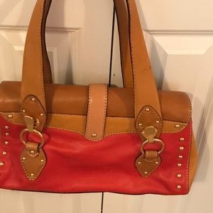 Red and camel Michael Kors handbag. The width at the base is 14 inches and top to bottom is 7 inches. Spot on inside( see picture).