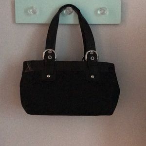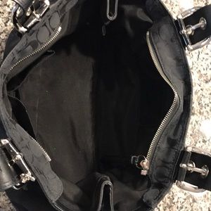 Authentic Coach Signature Handbag in black with patent leather black trim and also has feet on bottom. Measures 8 1/2" h x 13" l x 5" w with adjustable 9" strap drop. No rips, holes or stains. Excellent condition