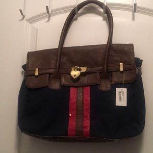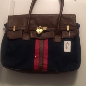 Navy blue with red and brown stripe handbag accessorized with a keyhole gold heart. Brand new never used. Minor nicks on front of bag.