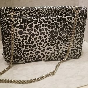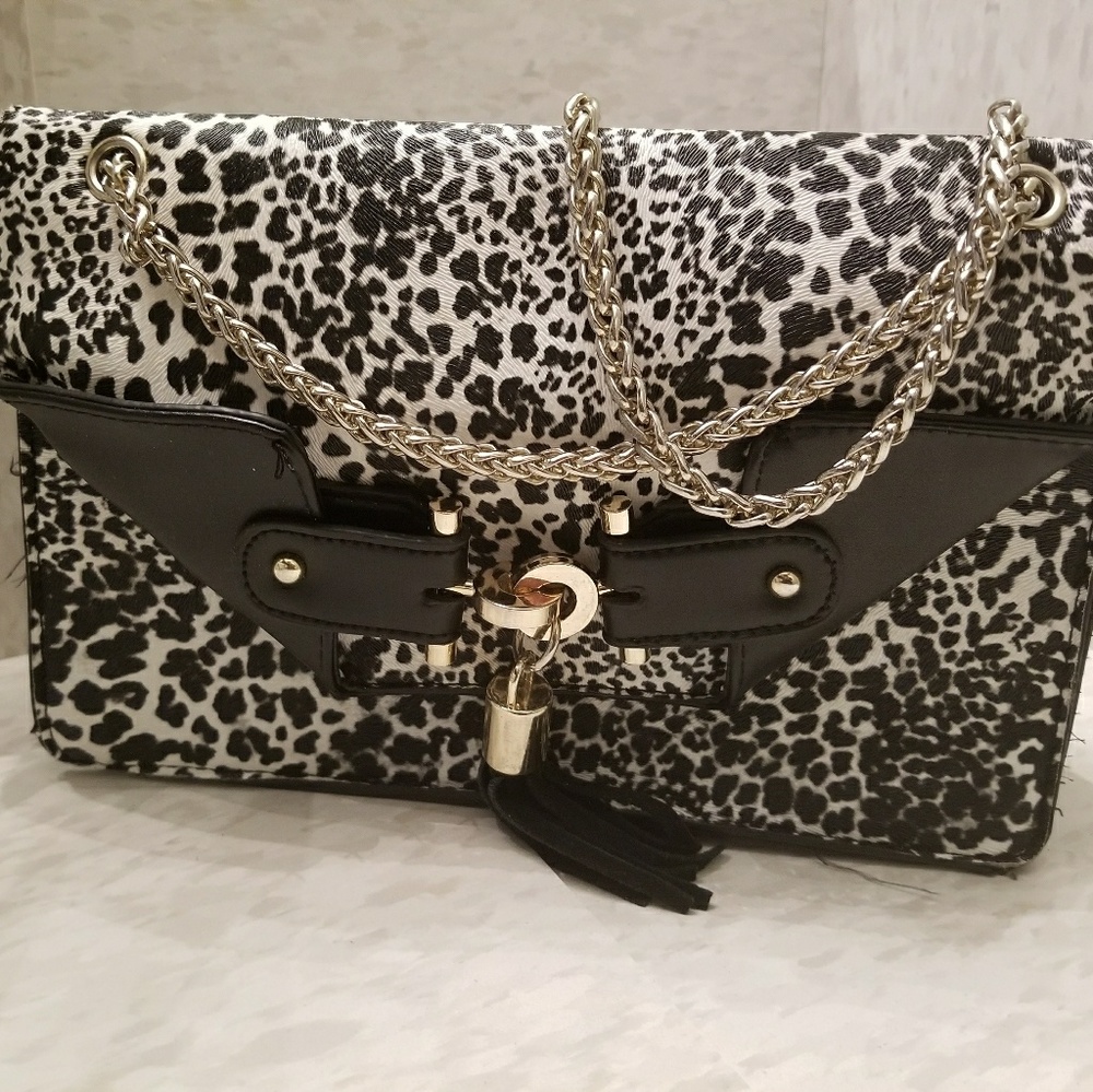 Purse from shoedazzle. Has been worn many times. Bag handle(chain) has faded a little. Minor wear and tear as you can see in the photos. Still very cute and many compliments are given!