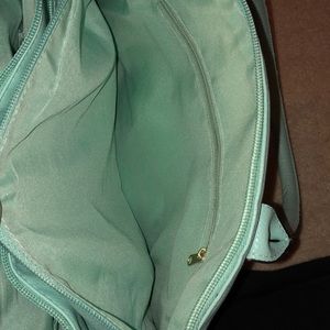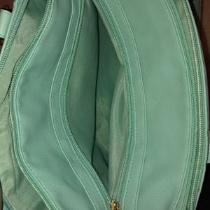 Turquoise handbag. Burlap front and back accents. 2 side pockets. Open pocket on back. Inside has 3 separate compartments. Center zip section. Front zip section has 2 non-zip pockets. Back zip section has zip pocket.
