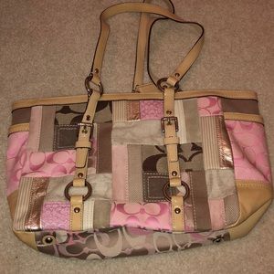 Light tan and pink patchwork handbag. 2 pockets on side. Zip closure. 1 zip pocket on the inside. 2 non-zip pockets on inside.