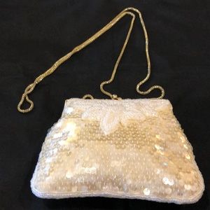 Beaded handbag. Long gold chain. Elegant evening bag. Inside pocket. Satin lined. Hardly used.