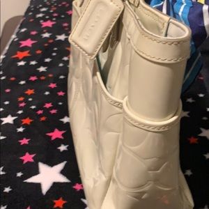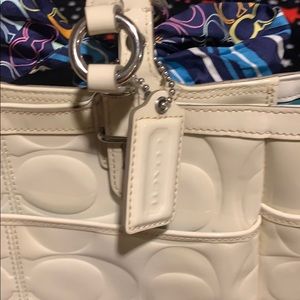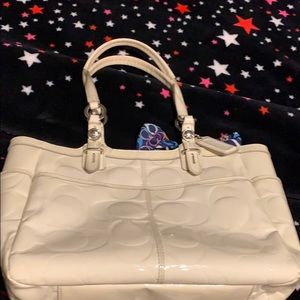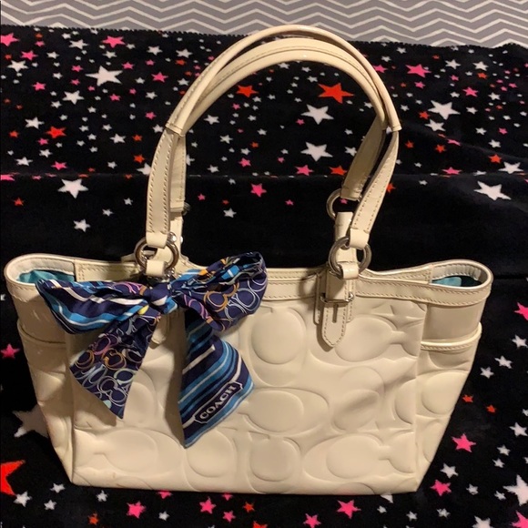Beautiful ivory Patent leather handbag. Two exterior side pockets as well as one exterior front pocket. Interior satin sea foam color with three compartments one zippered. Signature “C” embellishments throughout. I’ve added a coach neck scarf tied into a nice bow.