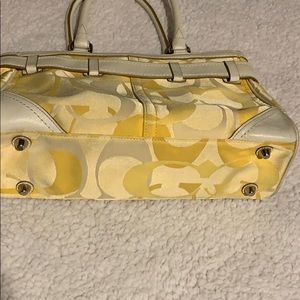 Coach signature fabric handbag. Fabric has been treated to be water and stain resistant. Top zip closure. White accent leather. Metal feet. Sturdy white leather top handles. Two interior multifunctional pockets and one zippered pocket.