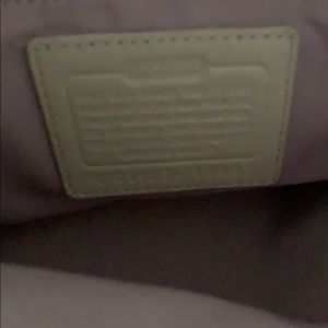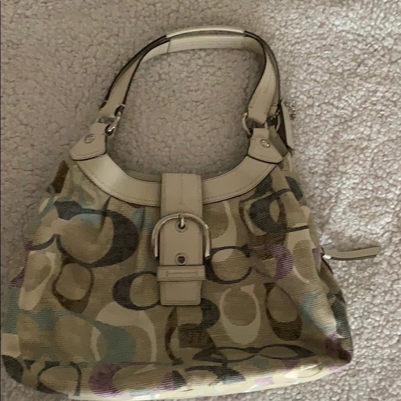 Beige signature coach collection bag with multiple colors. Treated fabric is water and stain repellent super spacious! Center zippered closure. Front adjustable buckle snap closure. Cream colored straps. 3 separate compartments with zippered pockets and multifunctional pockets.