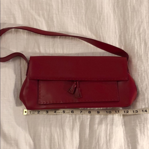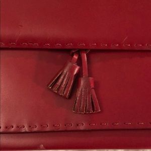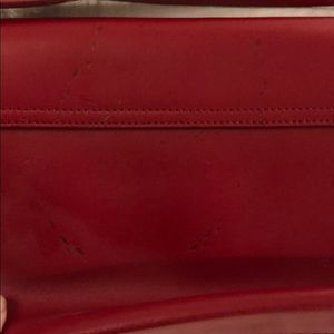 Small red leather handbag. Cute with bows on front. Some markings front and back but hard to see. Otherwise in good shape.