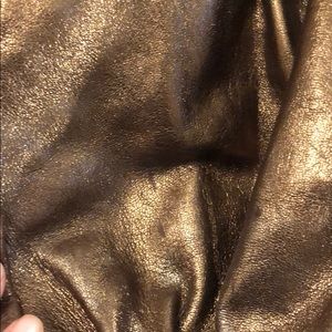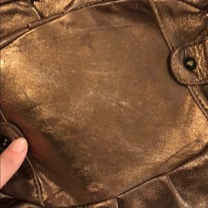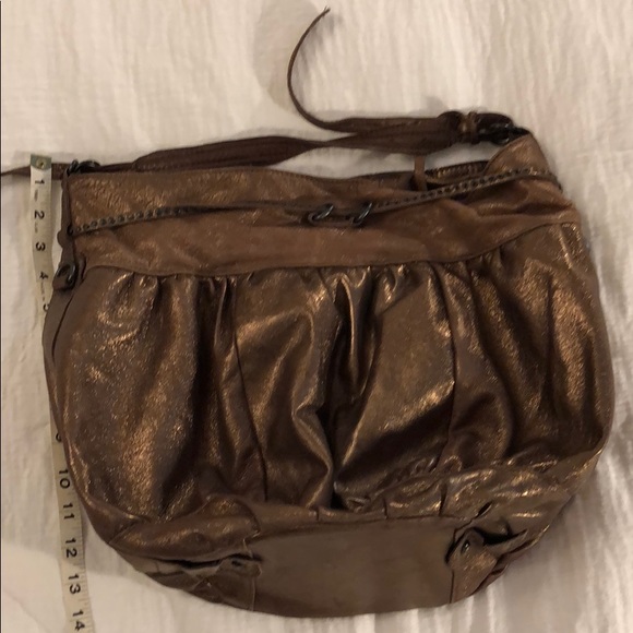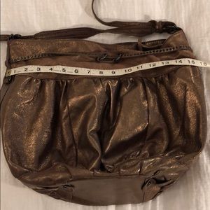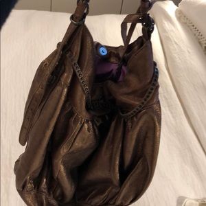 Shiny brown very soft leather hobo bag. Good shape with few visible scuffs. It’s a non structured bag so it collapses easily.