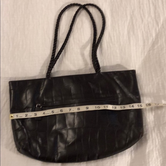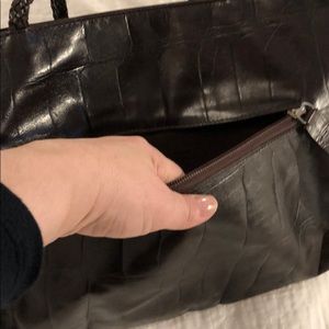 Dark brown leather tote looks crocodile-Ish in pattern. Outside pocket. Good shape.