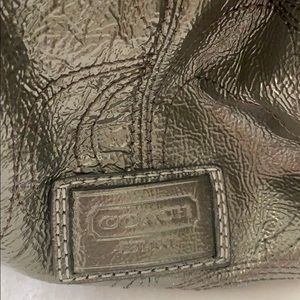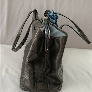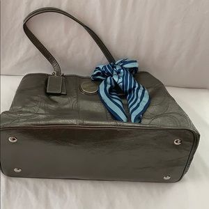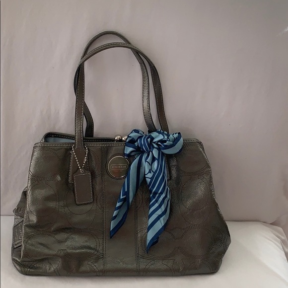 Gray patent leather coach carry all handbag/satchel. Silky blue lining. I’ve added a silk blue stripped scarf tied into a bow accent. Center compartment features metal ball lock closure. Inside zippered pocket and two multifunctional pockets. Metal feet. Dimensions: 14.5(L) x 10(H) x 5 (W)