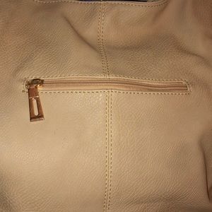 Beige color shoulder bag / tote with copper color design embellished with rhinestones on front of bag. NWT comes with straps. Interior is beige color lining as well with 4 pockets 2 large and 2 small. Also zip closure pocket on back of handbag. Gold tone hardware 15βW x 12βL x 9β W with 7β double handle drop. Never used. ππππ―ππππ