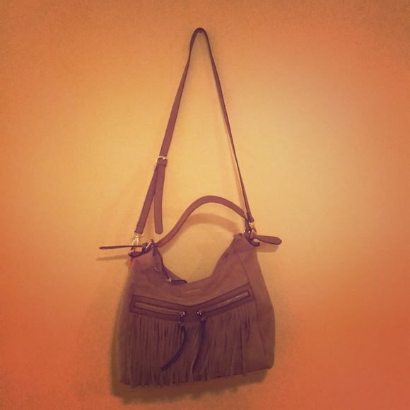 Gorgeous suede-like Southwestern-style bag with double zippered pockets on front and an inside zippered pocket. Has hand strap and shoulder strap.