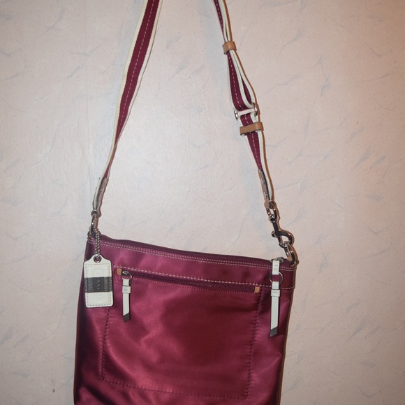 Deep wine, double strap small handbag. Zipper closer outside and zip closer inside with open pockets. Brand new, never used. Casual run around purse, great with jeans.