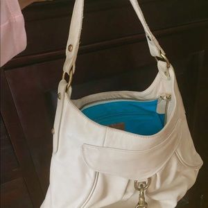 Cream colored leather handbag by Rachel Nasvik in excellent condition except for a little bit of wear at the strap. One zippered pocket on the inside which is lined with bright blue cotton material and one outside pocket that closes with a clip as shown in photo.