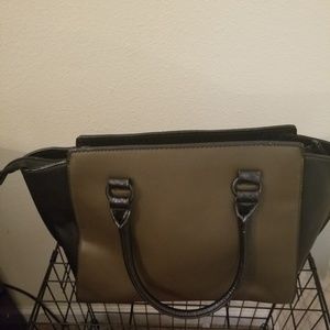 Olive green and black leather handbag. This bag comes with a matching strap. It can be worn long or you can hold the attached handles
