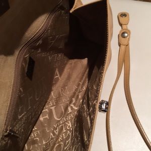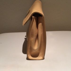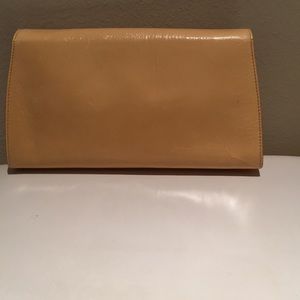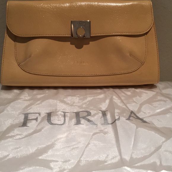 Furla clutch with attachable shoulder strap. Color in golden tan. Round knob turns to open. Never used in mint condition.
