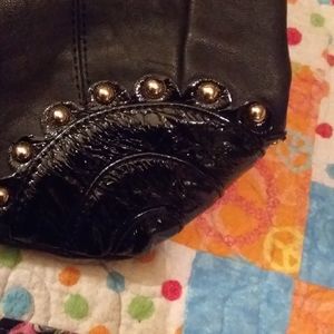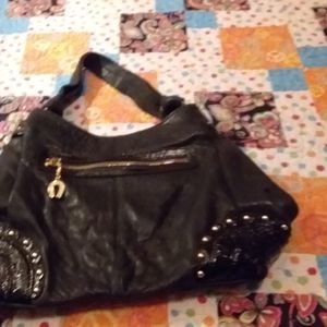 Beautiful Betsey Johnson Guns and Rosettes butter soft, leather handbag, with patent leatger trim. It has gold studded embellishments. Bonus Betsey Johnson coin purse key fob. Betsey no longer makes the genuine leather handbag. Hard to find. Handbag Measures 14x16x8 inches. Coin purse measures 4x6 inches. Shoulder drop measures 9 inches