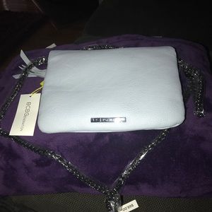 Shoulder adjustable chain link powder blue handbag. Really cute crossbody with denim.