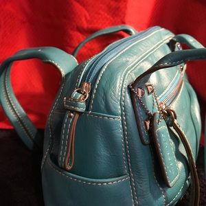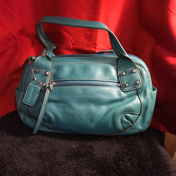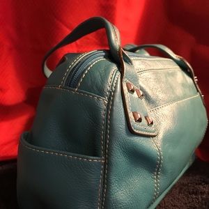 St John’s Bay burst of turquoise, soft genuine leather handbag with zipper closure. This bag has unique storage,... notice the end pockets, possible storage for cell phone or keys for easy access.