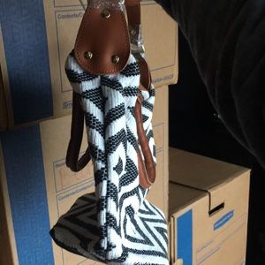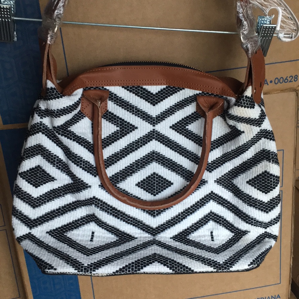 Tribe Alive Fabric Handmade by Female Artisans Handbag with leather details and handles. New. 14”H, 18” W 5.5” Handle drop. 40-50” Crossbody.