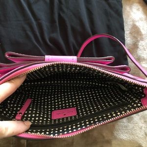 Pink leather crossbody bag.