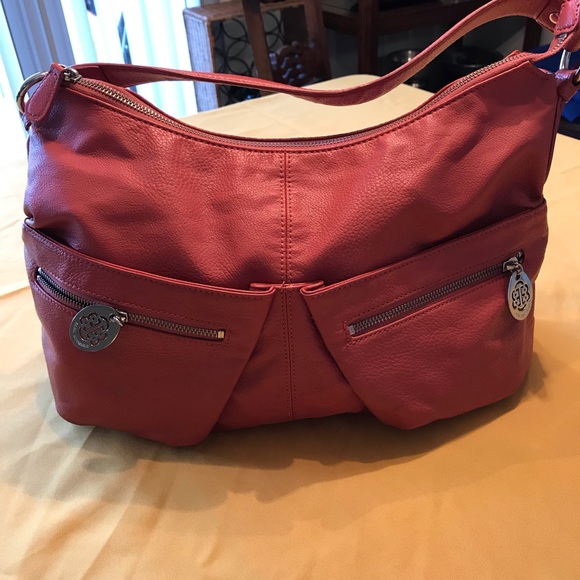 Hobo style handbag. Deep coral color. 4 front pockets zipper closure. Inside with two flap pockets 1 zipper pocket and 1 large flap pocket.