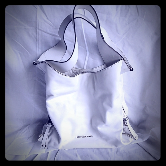 Michael Kors. White leather with chrome hardware. Zipper detail. Perfect for spring.