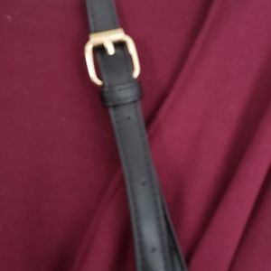 Beaitiful faux leather, quilted flap, magnetic snap on flap/zipper inside closures, zippered pockets on outside in front and back, long adjustable strap, gold tone hardware, like new