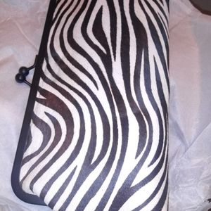 Faux Zebra Hair & Print shoulder or crossbody bag...black leather back...inside has credit card slots...black elegant chain...duster bag included and it has a black elegant bracket closure.