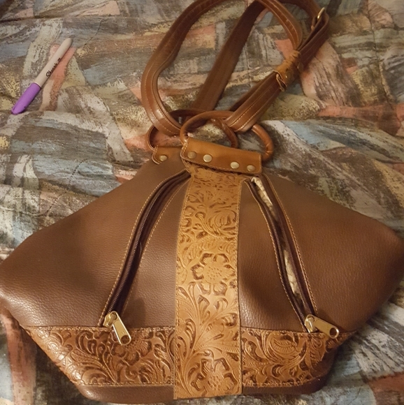 It's a small brown handbag It has two zippered compartments in the front and one on the inside.