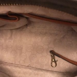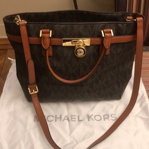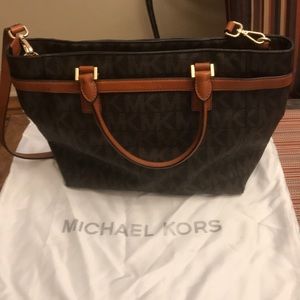 Michael kors leather satchel double handle adjustable strap of 10” bag is 10”13 perfect condition not even used and it’s the signature bag