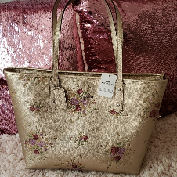 NWT auth metallic (platinum multi) Coach floral handbag