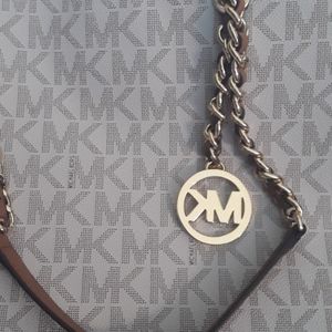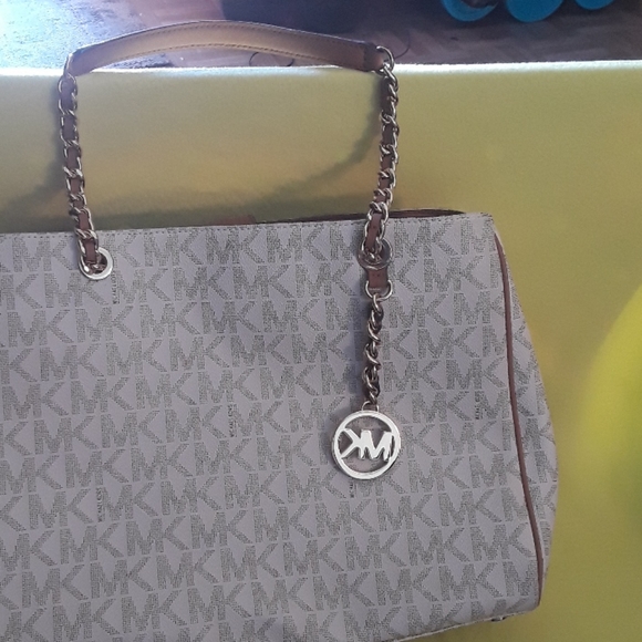 Large beige tote, 2 chain&leather handles, top closure, 2 large zip pockets inside,4 pouches inside
