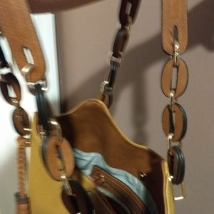 Mustard cognac tassle shoulder bag. Brand new. Straps are leather links w gold accents . Great buy!!!