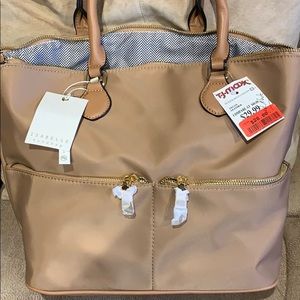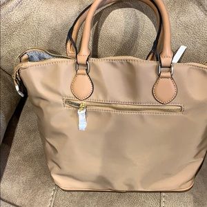 Microfiber satchel. Handles are not leather. Never used slight pen mark on bag.