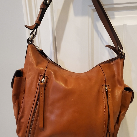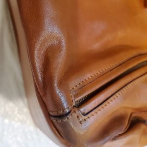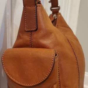 Brown leather hobo with side pockets adjustable shoulder straps clean interior soft leather comfortable straps. Great handbag for the fall. Match it with the boots I have listed.