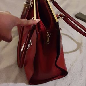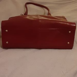 @symonec973912 red, leather, 10-11” width, around 10” high, top handles with shoulder strap