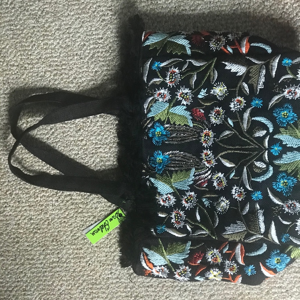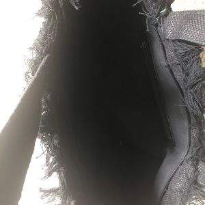 Gorgeous black handbag/tote. Has lots of detail. Sassy fringe. Black burlap on one side. Gorgeous detailed embroidery. Brand new.